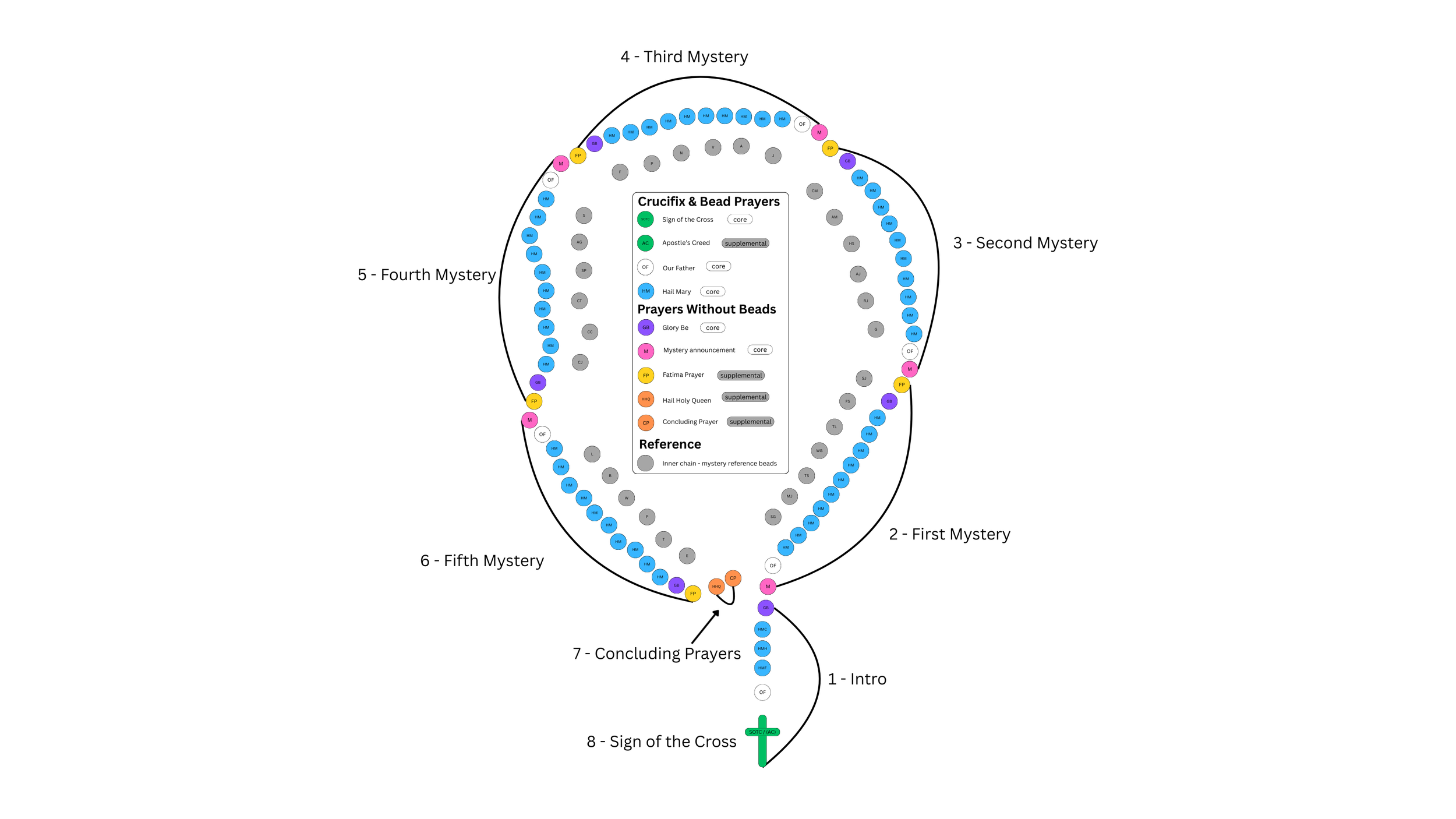 The gray mystery reference beads in the inner chain of the diagram will help you know 1) which set of mysteries to focus on any given day, and 2) what the five mysteries are in that day’s set of mysteries.